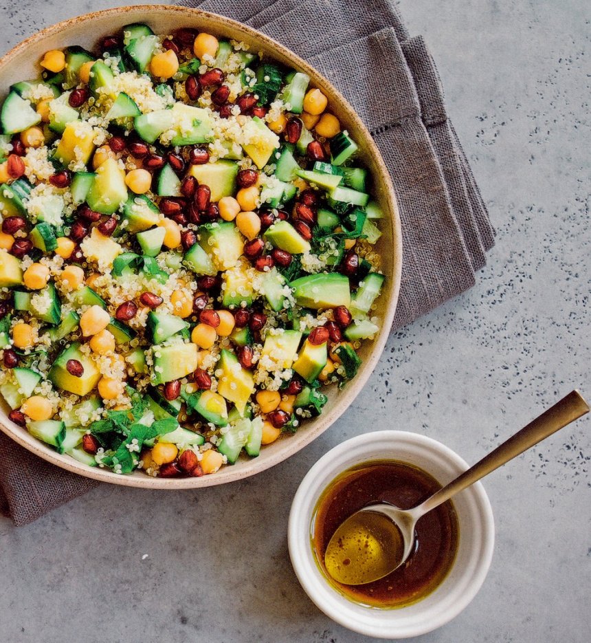 Ensalada de quinoa, aguacate, pepino, garbanzos y granada The cook