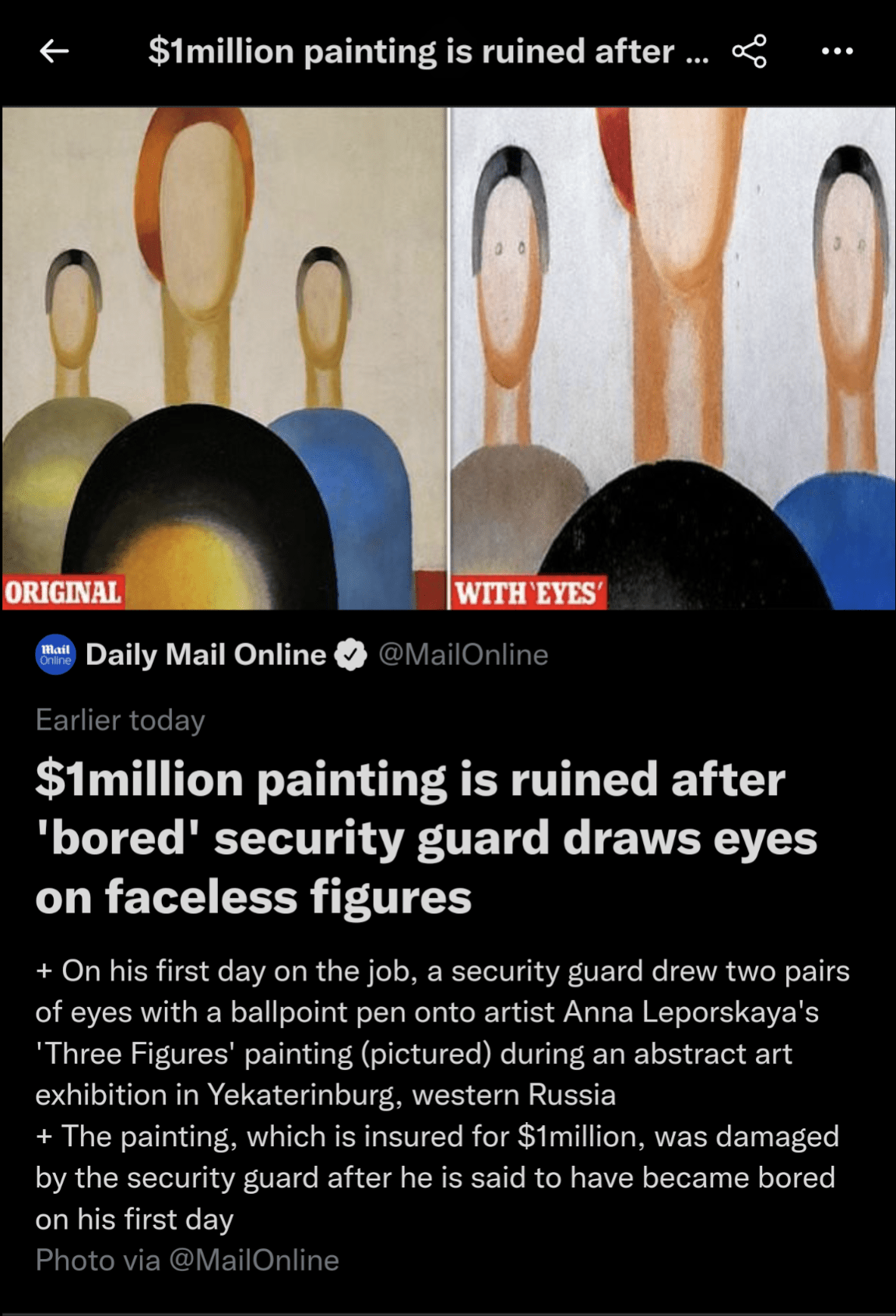 LOOK 1MILLION painting is ruined after 'bored' security guard draws Painting Eyes Security Guard A painting worth £740,000 has been ruined after a security guard drew two pairs of eyes on the faceless figures on his first day on the job. A painting worth £740,000 has been destroyed after a 'bored' security guard drew eyes on faceless figures depicted in the artwork at a. A security guard at a russian art museum made quite. Painting Eyes Security Guard.