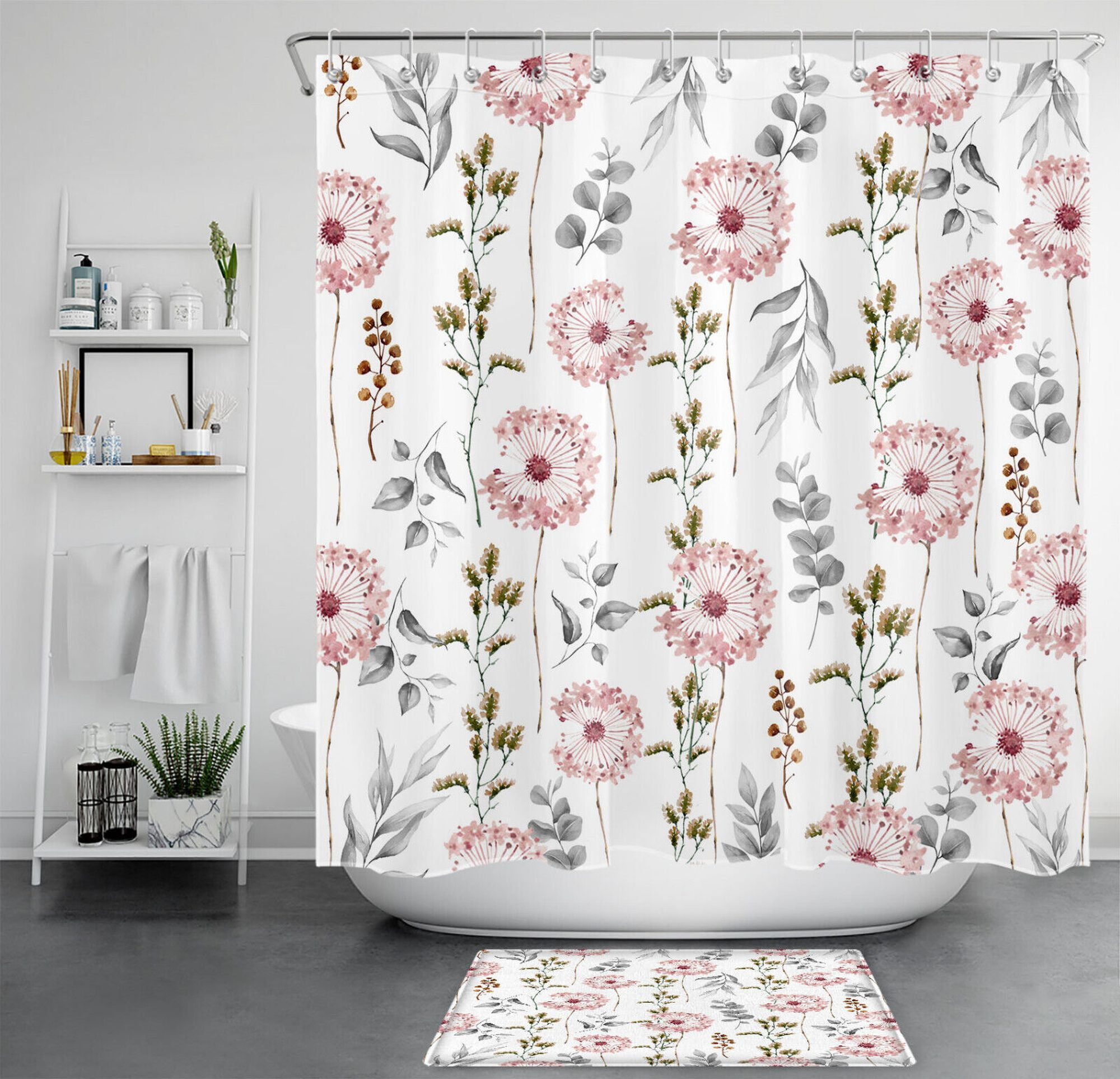 Spring Blossom Floral Shower Curtain Pink Wildflowers and Gray Leaves Bathroom Decor