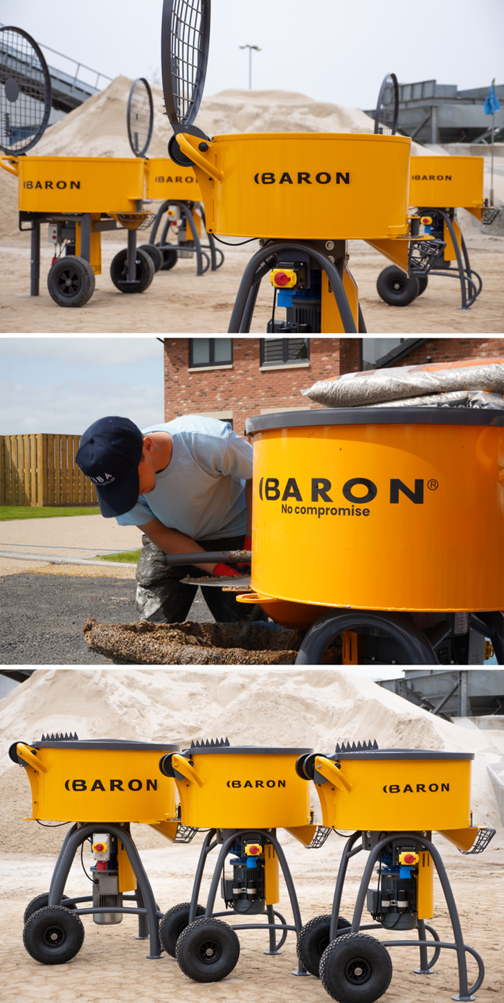 Baron Mixer Hire Baron produces efficient forced mixers and robust conveyor belts. Baron produces efficient forced action mixers, robust conveyors, the groundbreaking smartmover, and a large selection of construction tools for landscape gardeners and pavers. Discover our extensive range of forced action mixers available for hire, to meet diverse construction requirements. Baron produces efficient forced mixers and robust conveyor belts. The baron f120 forced action mixer is one of our smaller 110v powered pan mixers.