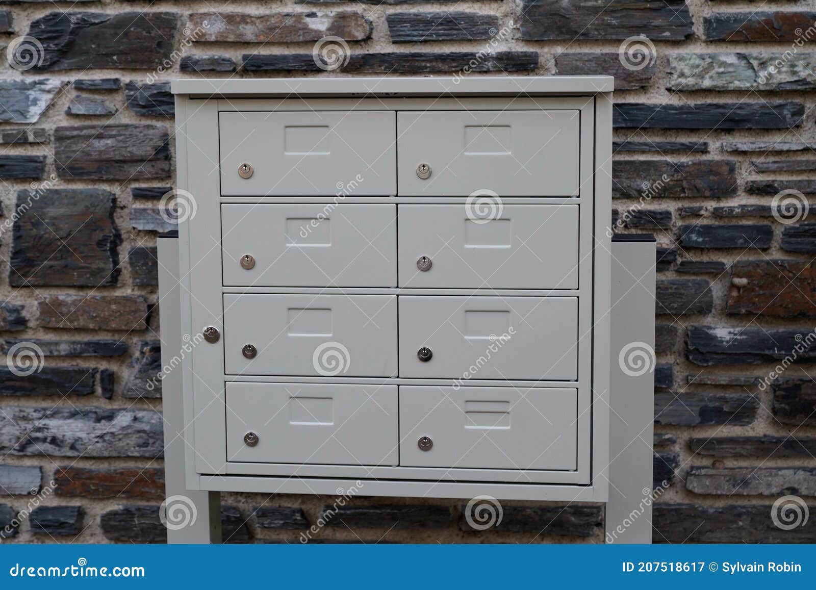 Mailbox Post Wall at Apartment Complex or Row of Post Office Boxes in a