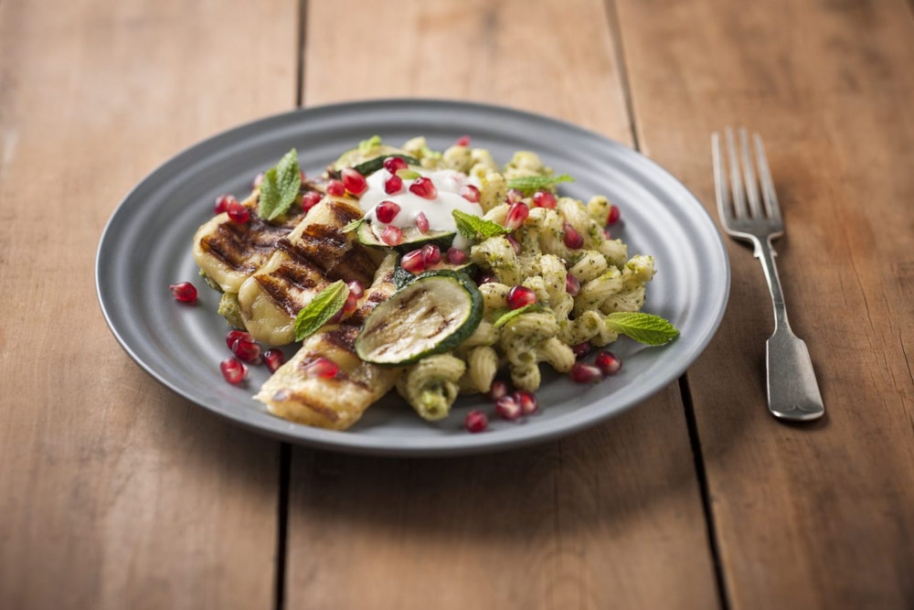 Easy Green Pesto Pasta with Roasted Veggies [vegan] Roasted veggies Green Pesto Halloumi Pasta 1 medium green serrano chile, stemmed and halved lengthwise. The quick and easy garlicky rocket pesto adds colour and freshness to this cannellini bean and halloumi pasta dish. Peppery rocket leaves are combined with zesty garlic to produce a flavour packed sauce that is tossed with an dente pasta and tender cannellini beans then topped with crispy fried halloumi cheese.. Green Pesto Halloumi Pasta.