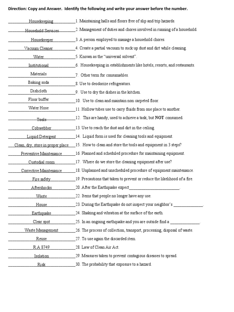 Quiz & Worksheet Housekeeping in the Hospitality Industry Housekeeping Safety Quiz How good a housekeeper are you? Quiz your students on the 5s of good housekeeping practice problems using our fun classroom quiz game quizalize and personalize. This is a housekeeping trivia that is designed to test you on workplace health and safety. Contact hazards are objects you can bump into or objects that can hit you. Everyday people show up. Housekeeping Safety Quiz.