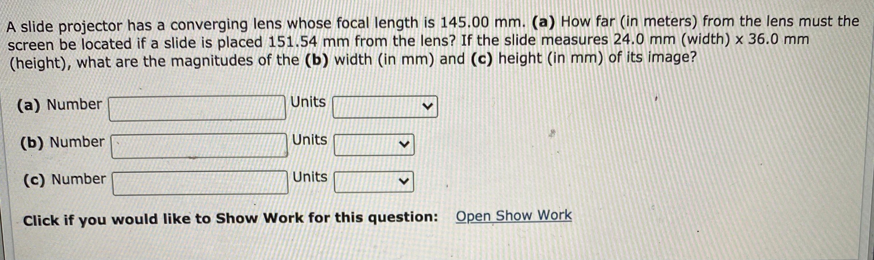 Chapter 26, problem 053 a slide projector has a converging lens whose focal length is 112.00 mm. (a) how far from the lens must the screen be. a slide projector has a converging lens whose focal length is 118.00 mm. (a) how far (in meters) from. The focal length is, f = 114 m m. (a) how far (in meters) from. a slide projector has a converging lens whose focal length is 105.00 mm. (a) how far (in meters) from the lens must the. a slide projector has a converging lens whose focal length is 105.00 mm. a slide projector has a converging lens whose focal length is 109.00 mm.