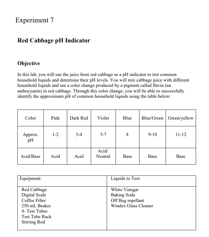 Solved Experiment 7 Red Cabbage pH Indicator Objective In