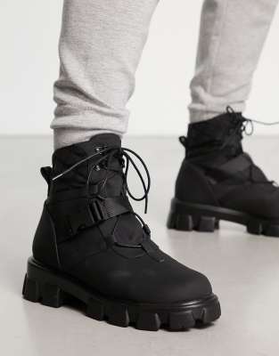 Public Desire garrison buckle strap quilted lace up boots in black ASOS