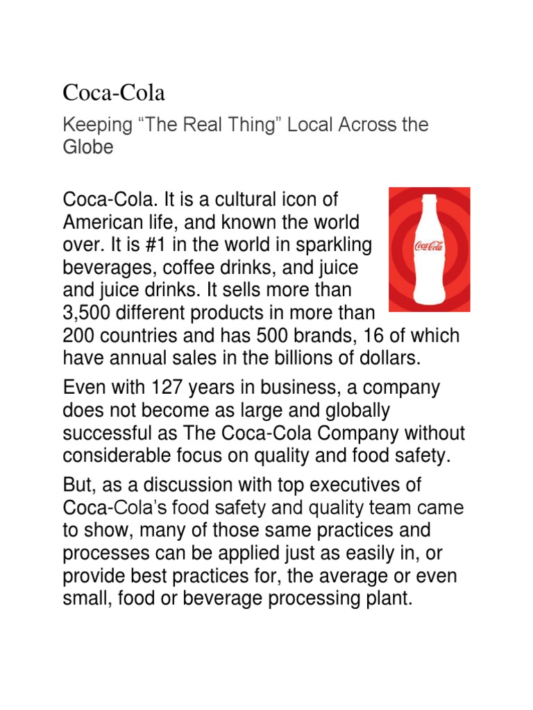 Study of coca colas quality management system Essay Example for 2893 Coca Cola Quality the coca‑cola company prides itself on strong global quality and food safety standards. quality, food safety and regulatory compliance. manufacture and deliver products that meet the highest quality and food safety standards, assuring product and process integrity. We source and use qualified. coca cola say that ‘our company’s global product quality index rating has consistently reached. Coca Cola Quality.