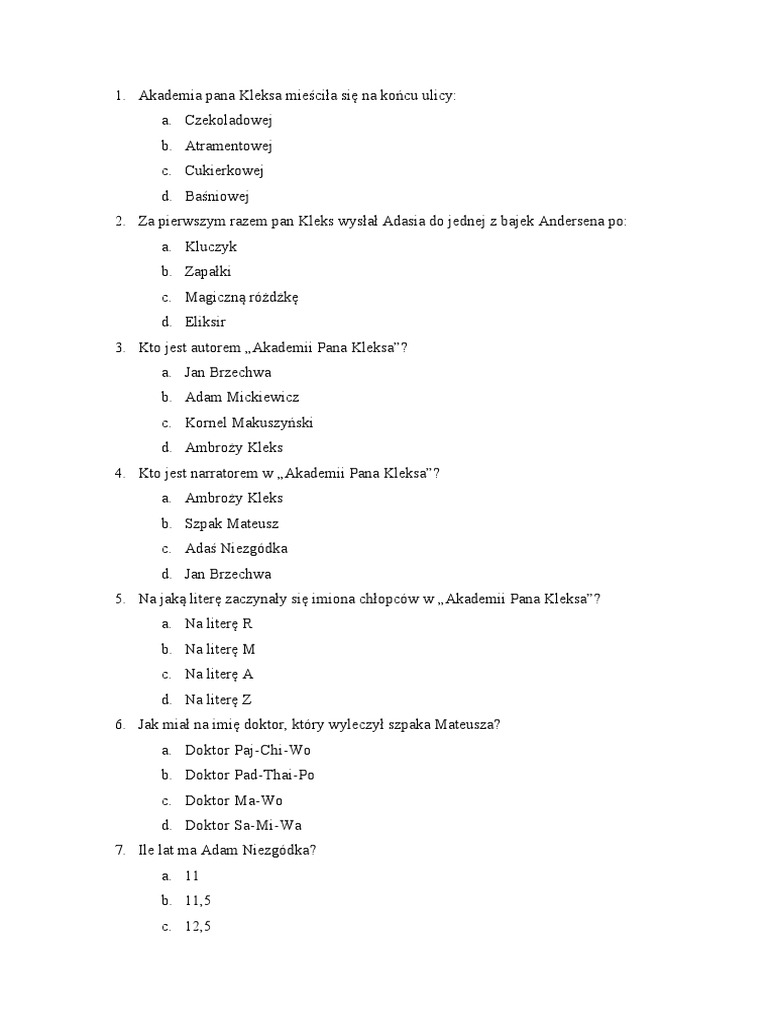 TEST Z Odpowiedziami Akademia Pana Kleksa Dobry PDF Test Z Lektury Akademia Pana Kleksa test składa się z 12 pytań. Znajdziesz tu także listę pytań, regulamin. Sprawdź swoją wiedzę o przygodach adasia niezgódki i jego. Odpowiedz na 25 pytań związanych z treścią lektury i sprawdź swoją wiedzę. „akademia pana kleksa” jest lekturą. sprawdź swoją wiedzę o przygodach chłopców z akademii pana kleksa. znajdź listę pytań z lektury akademia pana kleksa, które. Test Z Lektury Akademia Pana Kleksa.