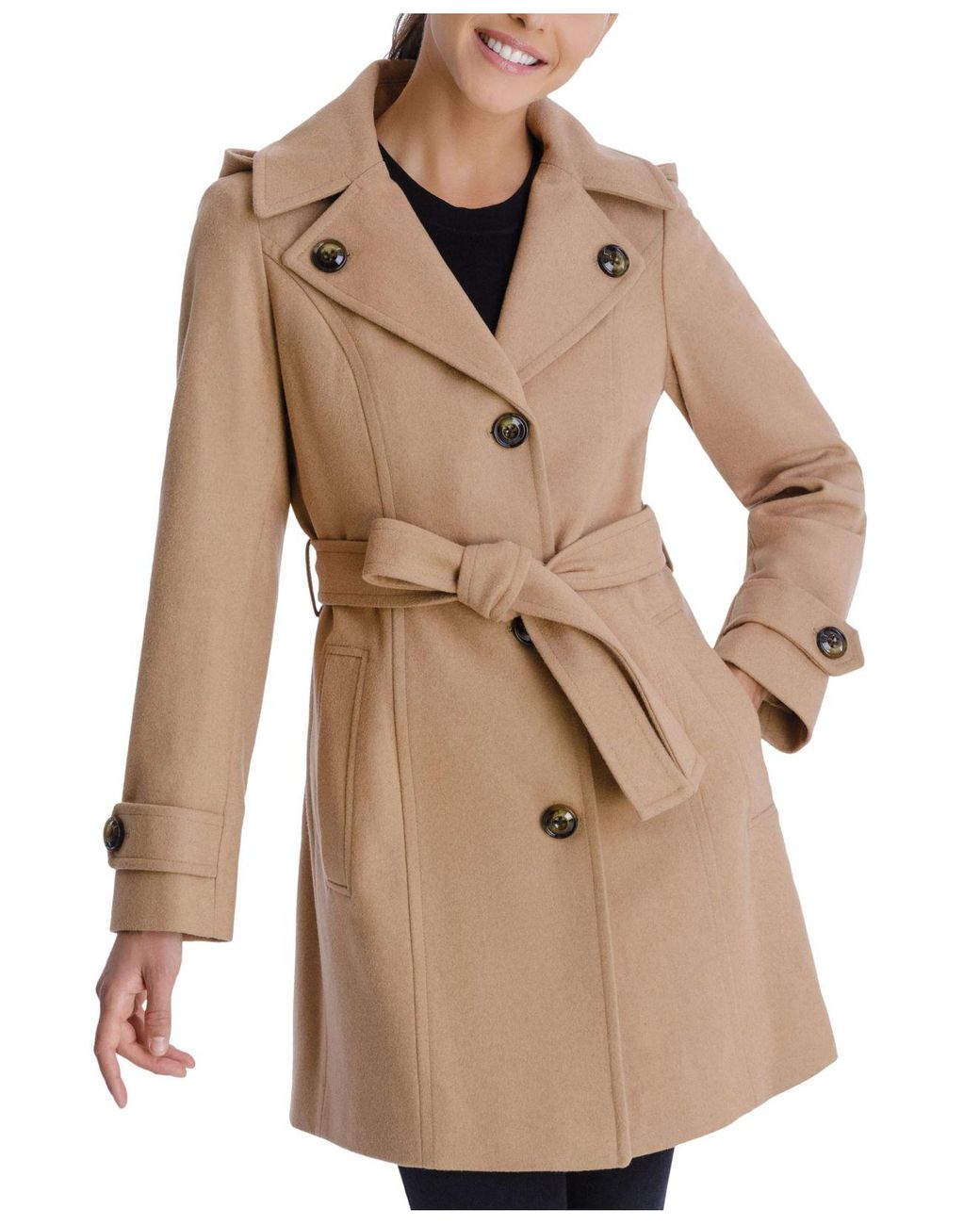 London Fog Wool Singlebreasted Belted Hooded Walker Coat in Camel