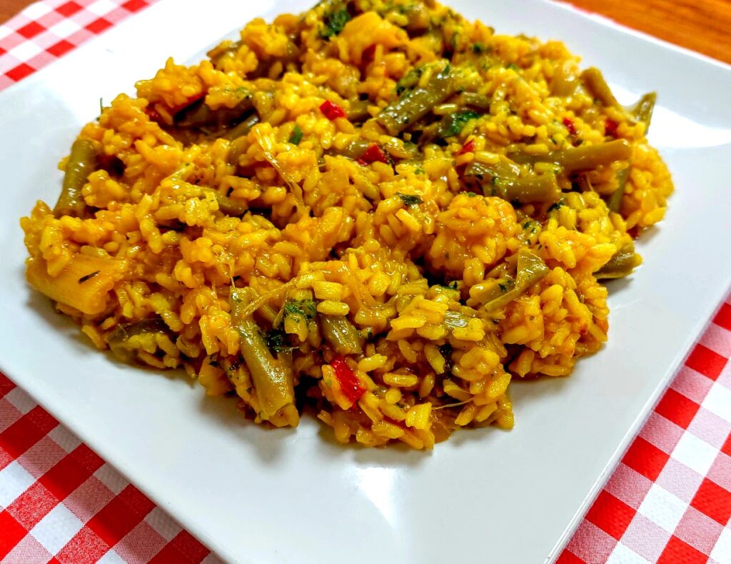 Paella de verduras (Plato vegano) Mantel de Cuadros