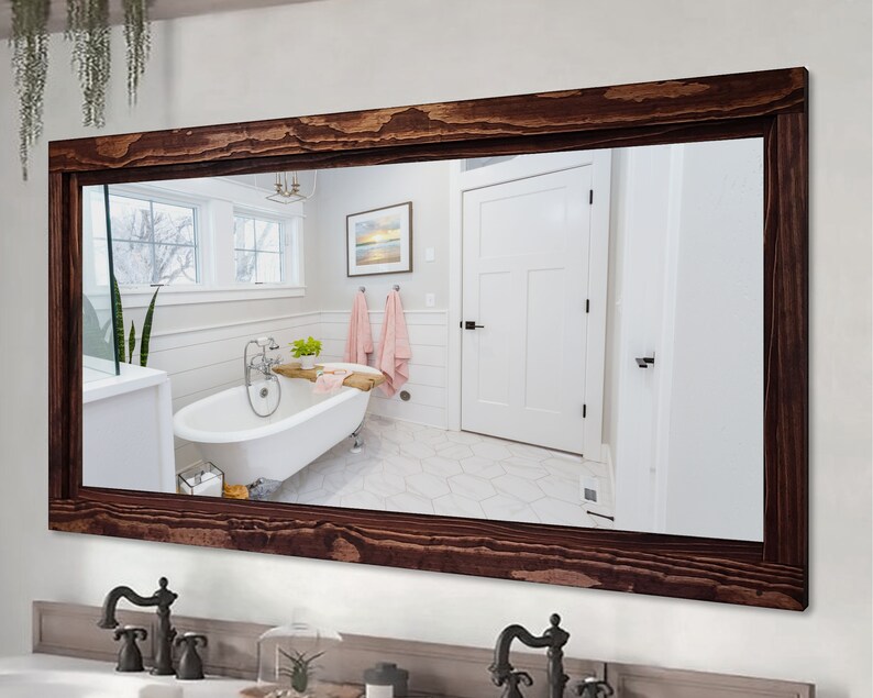 Farmhouse Framed Wall Mirror 20 Stain Colors Rustic Wood Etsy Farmhouse Framed Wall Mirror Rustic wooden framed wall mirror for bathroom, farmhouse decorative natural wood vanity mirror, wall mounted rectangular mirror for bedroom. Complete your industrial farmhouse décor with this unique distressed wall mirror. The 3 inch wooden frame has an angled front decorated with an inner distressed white border creating a unique coastal rustic feel. The 3 inch frame features a flat profile. Farmhouse Framed Wall Mirror.