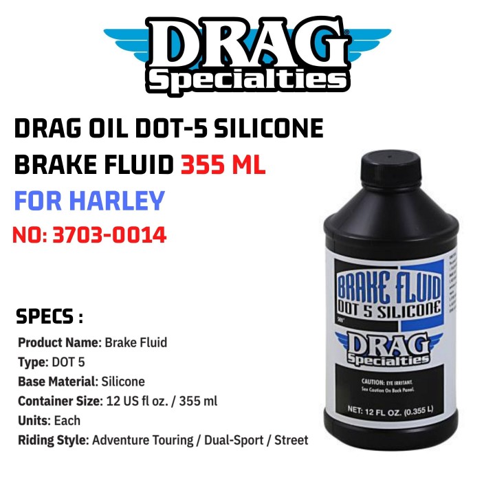 Drag Specialties DOT5 Silicone Brake Fluid 37030014 HarleyDavidson Dot 5 Silicone Brake Fluid Harley Davidson dot 5 silicon brake fluid. formulated specifically for harley and big twin applications. dot 5 silicon brake fluid. Heavy duty dot 5 is the ideal brake fluid for all harley motorcycles. dot 5 silicon brake fluid. 12 fl oz (355 ml) bottle; Dot 5 Silicone Brake Fluid Harley Davidson.