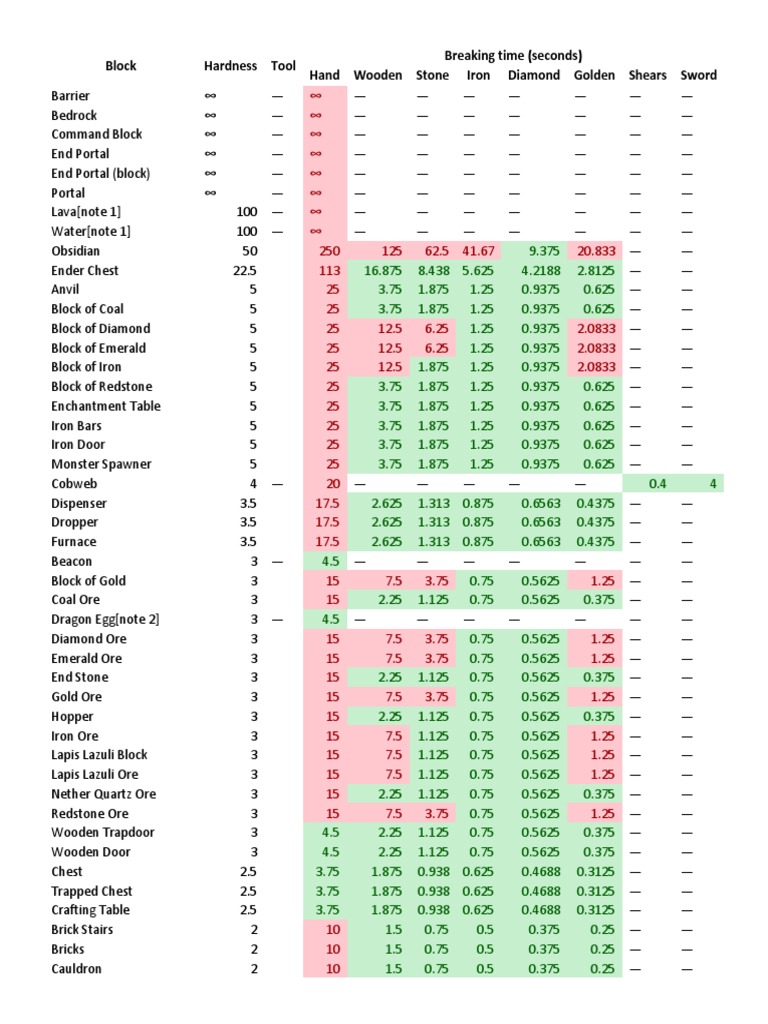 Minecraft Block Hardness Minecraft Materials