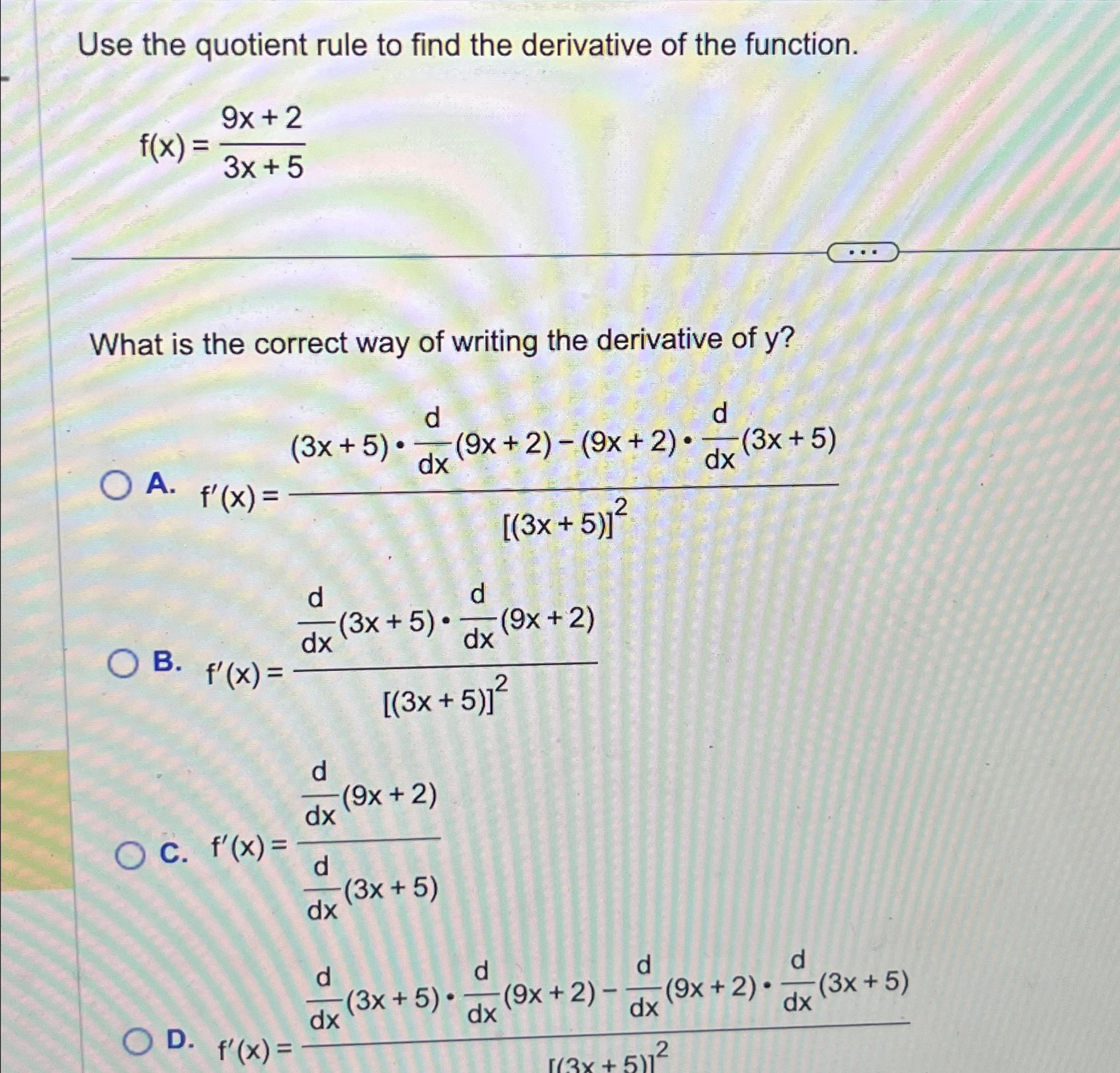 Solved Use the quotient rule to find the derivative of the