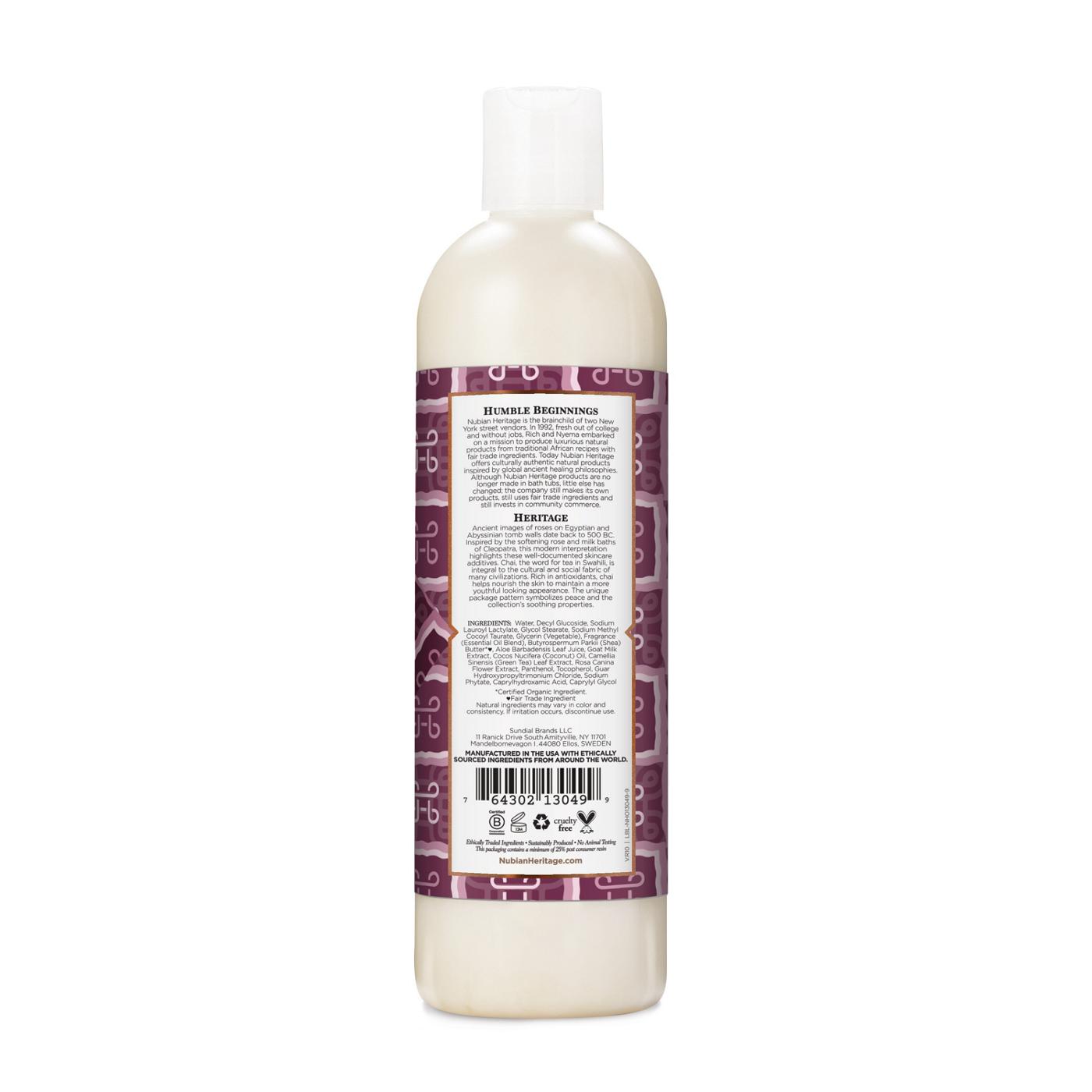Nubian Heritage Body Wash Goat's Milk & Chai 13 fl oz (384 ml) Goat's Milk & Chai Body Wash Rose extract corporation b corporation cruelty free ethically traded ingredients sustainably produced no animal. a gentle, creamy body wash infused with goat's milk, shea butter, chai, and rose extracts, that cleanses while keeping skin. wash away your cares and reveal more radiant skin with goat's milk and chai body wash from nubian heritage featuring. A gentle, creamy body. Goat's Milk & Chai Body Wash.