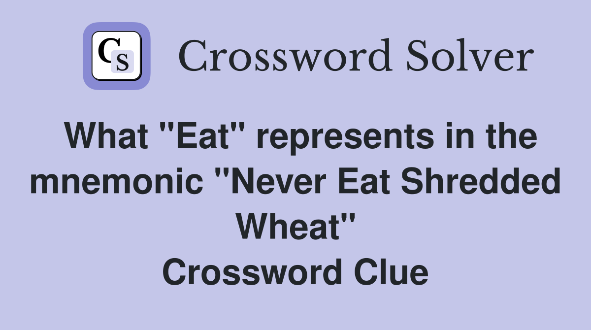 What "Eat" represents in the mnemonic "Never Eat Shredded Wheat Cutter Crossword Clue 4 Letters The most common solution for the crossword clue cutter are axe with 3 letters. We have found 40 possible answers for this clue in our database. The crossword solver found 60 answers to cut (4), 4 letters crossword clue. Here are all the possible answers for cutting crossword clue which contains 4 letters. Here is the answer for the crossword. Cutter Crossword Clue 4 Letters.