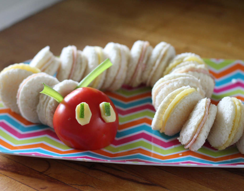 The Very Hungry Caterpillar Party Savoury party food, Kids party food How To Make Caterpillar Sandwich Lay 2 slices of bread out on a cutting board. Using a small, round scone cutter (or small, round cookie cutter), cut 2 circles per slice of bread. Place ham on one slice, then cover with the other buttered slice. Slice the apple, pear, cucumber and tomato. Or even just a fun after school snack to break the monotony of. How To Make Caterpillar Sandwich.