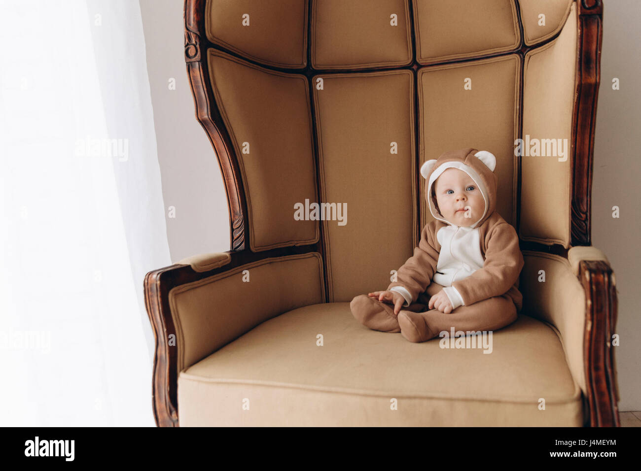Caucasian baby boy sitting in armchair wearing bear costume Stock Photo