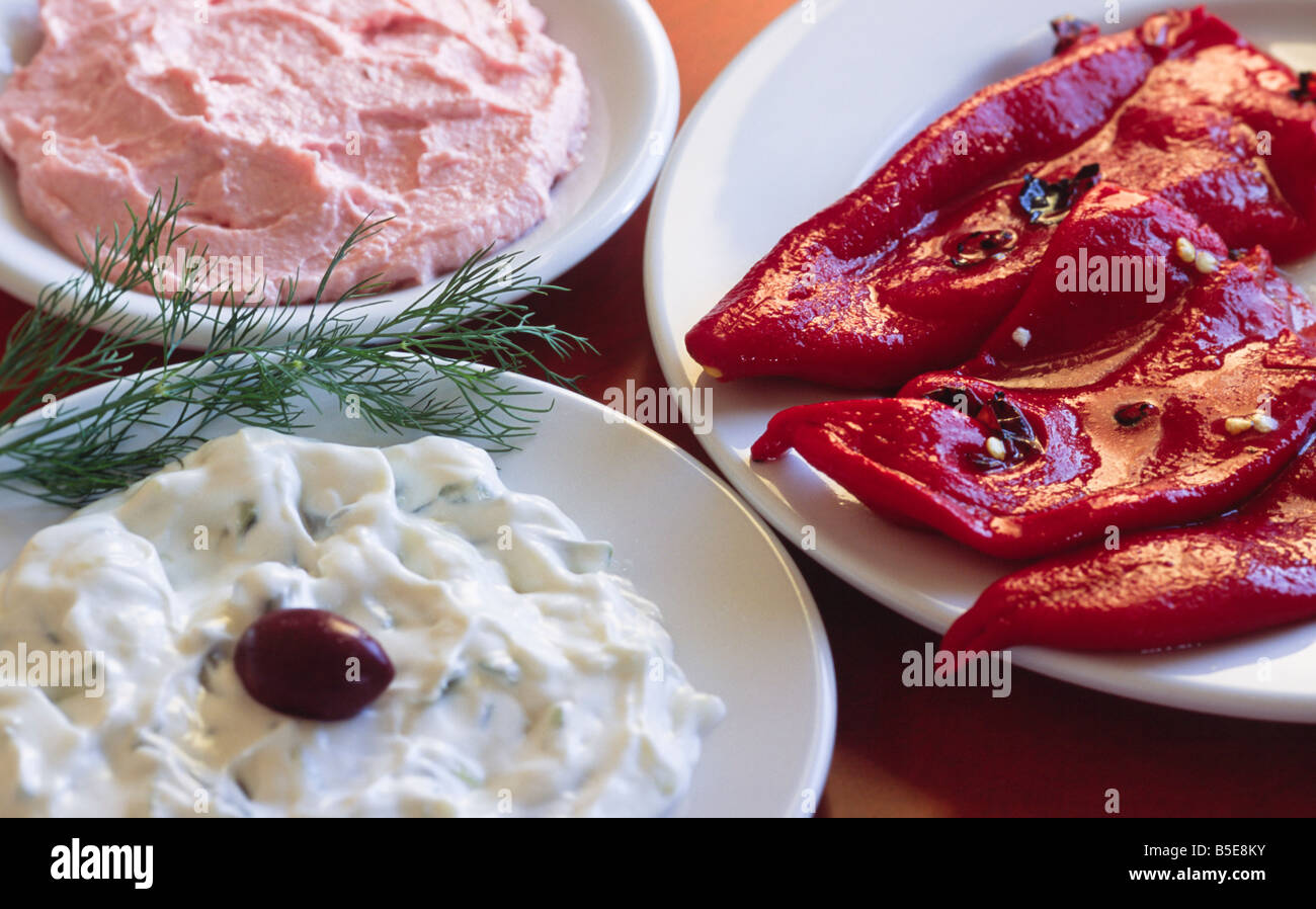 three Greek starters (mezes) Crete Greece Stock Photo Alamy