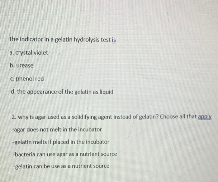 Solved The indicator in a gelatin hydrolysis test is a.
