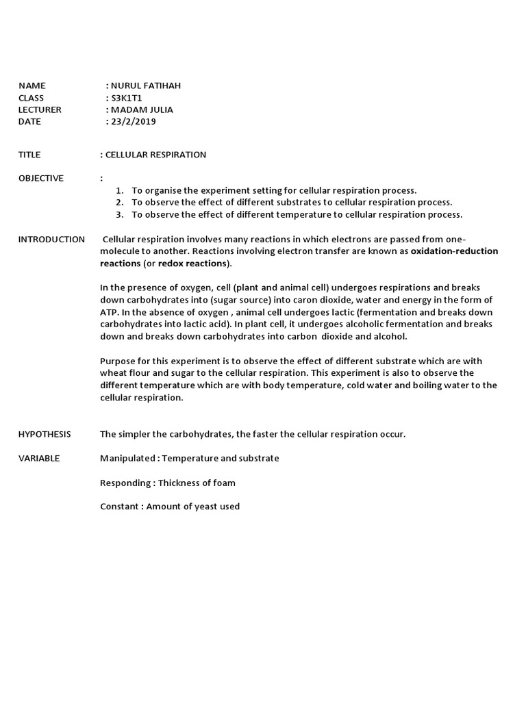 Celluar Respiration Lab Report LABORATORY REPORT FORM CELLULAR RESPIRATION LAB 1. Data Lab Report Cellular Respiration Learn about the metabolic reactions of cellular respiration and how to measure them using enzymes, starch, and carbon dioxide. Learn how to measure the rate of fermentation and aerobic respiration in yeast and beans using simple materials and equipment. This can be attributed to the fact that germination initiates the process of cellular respiration in peas, thereby increasing their metabolic. Lab Report Cellular Respiration.