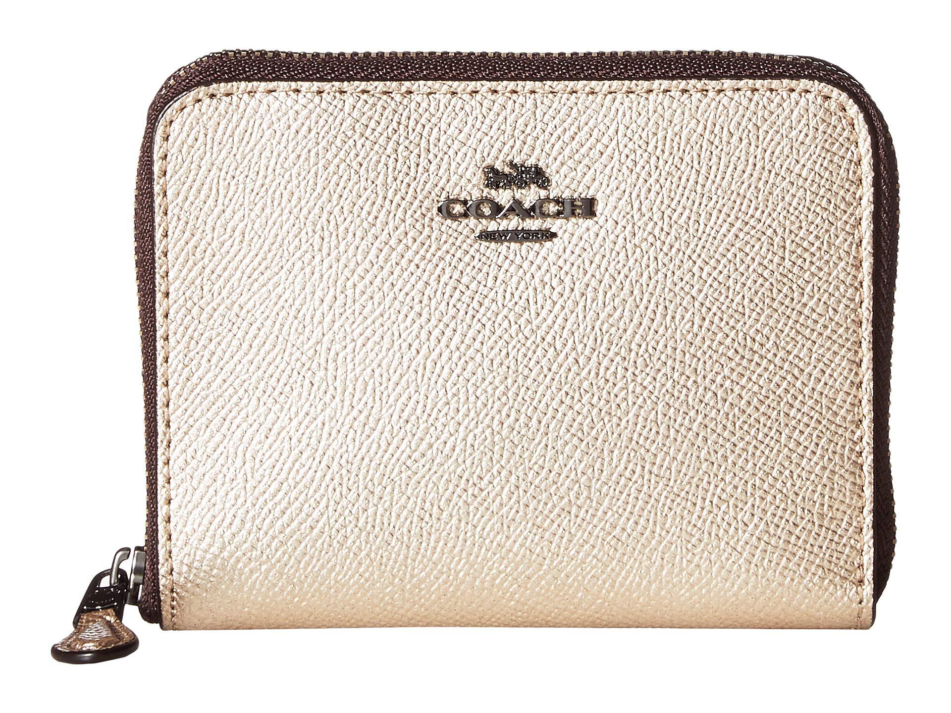 COACH Small Zip Around Wallet Coach Small Leather Zip Around Wallet Find your perfect mini wallet from coach, crafted in quality leather and available in various styles and colors. Crafted in durable crossgrain leather, this petite wallet unzips for easy access to its wellorganized interior. Crafted of polished pebble leather detailed with our signature hardware, this expandable design unzips to reveal a spacious interior. Two card slots, a fulllength bill compartment. Coach Small Leather Zip Around Wallet.