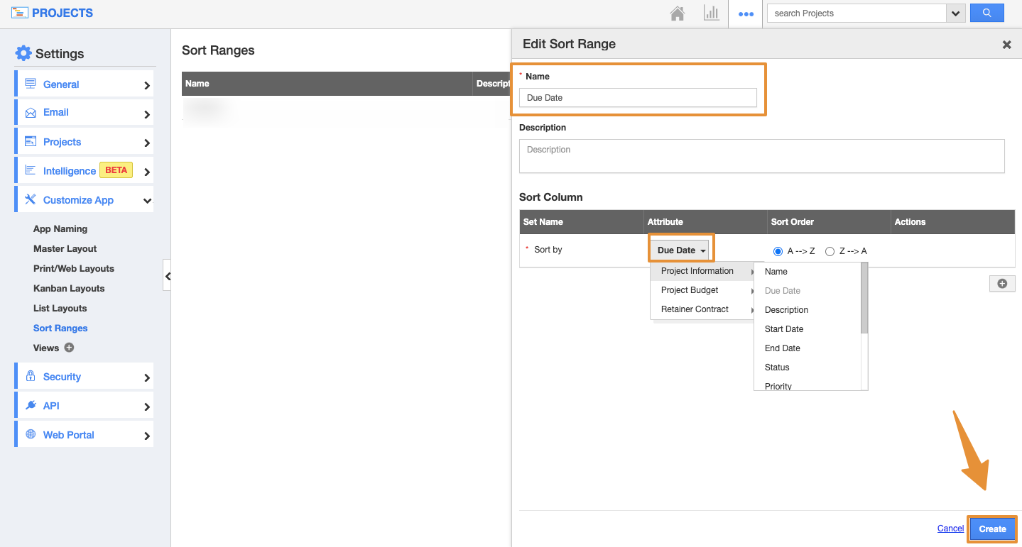 How do I view the Sort Ranges for the Projects app in iOS?