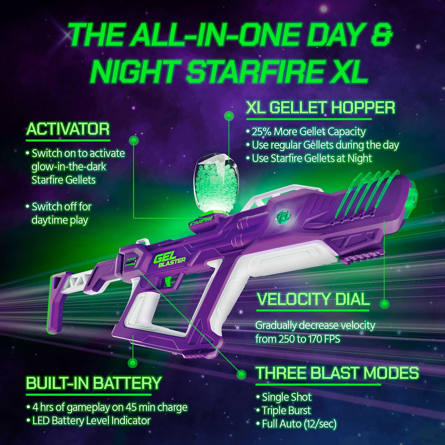 Gel Blaster Xl Starfire The biggest, baddest gel blaster day & night: Get outside and experience play in a whole new way with our original blaster—the gel blaster surge! Xl is the ultimate supersized gel blaster powerhouse designed for total battlefield domination. With modes for various playstyles, a large hopper capacity, and accurate shooting, it’s a Leave the haters in awe as you blast.. Gel Blaster Xl Starfire.