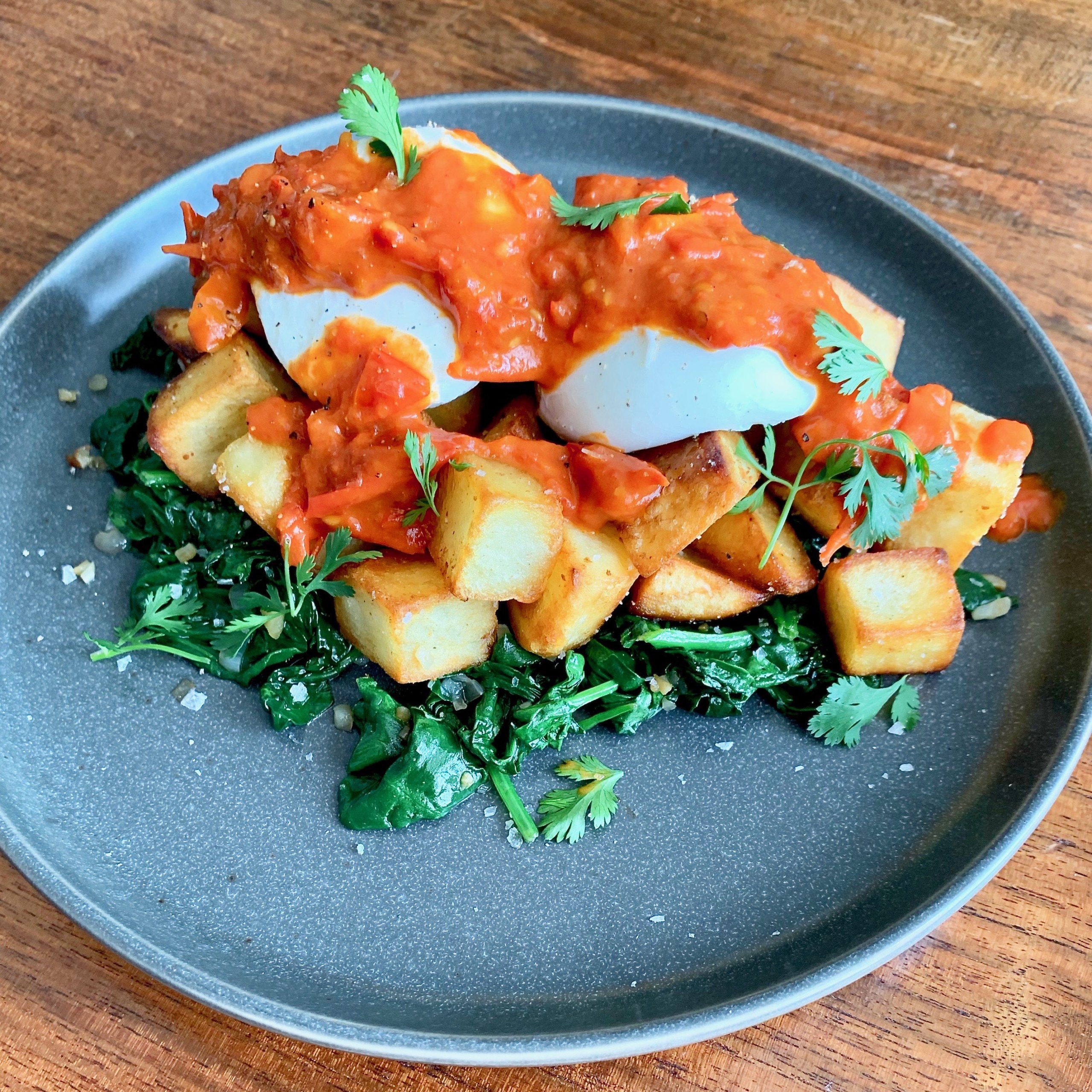 Crispy potatoes on sautéed spinach with poached eggs and spicy tomato sauce Dining and Cooking