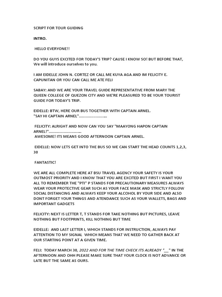 SOLUTION Tour guiding commentary or script Studypool Tour Guide Script Essay With a few smart adjustments, you can transform your script into something that will leave your audience not only informed but. 5 steps for writing a tour script. The document provides a summary of a tour guide's script for a tour of talisay, batangas in the philippines. Are you highlighting historical sites, local cuisine, or natural landmarks? The tour guide,. Tour Guide Script Essay.