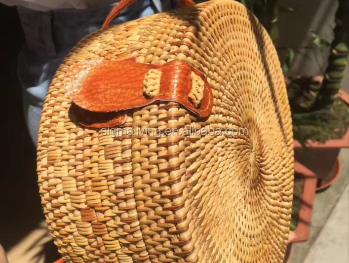 Vietnamese Handmade Rattan Round Bag Ladies Bag Pu Leather Buckle Round