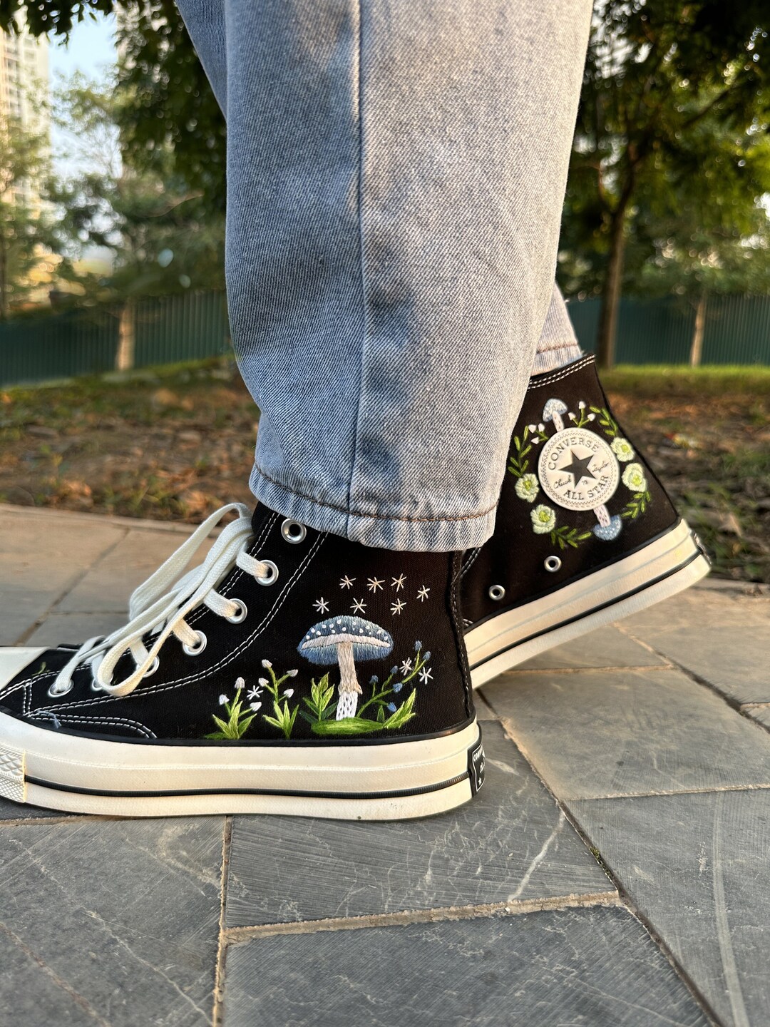 Custom Converse Embroidered Blue Mushroom and Small Flowers/ Converse High Top/ Wedding Sneaker