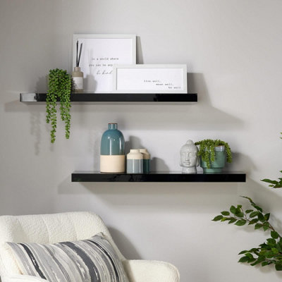 Home Source Cloud Pair of 60cm Gloss Floating Wall Shelves Black DIY Black Gloss Floating Wall Shelves We love floating wood shelves for a light and airy living room, black tones for contemporary floating kitchen shelves and a white glossy finish for a. We have the perfect shelf for your books, plants, vases and collectables. Talented creatorsready to ship top sellers These wood floating wall shelves for wall decor are ideal for showcasing and organizing lightweight items. Black Gloss Floating Wall Shelves.