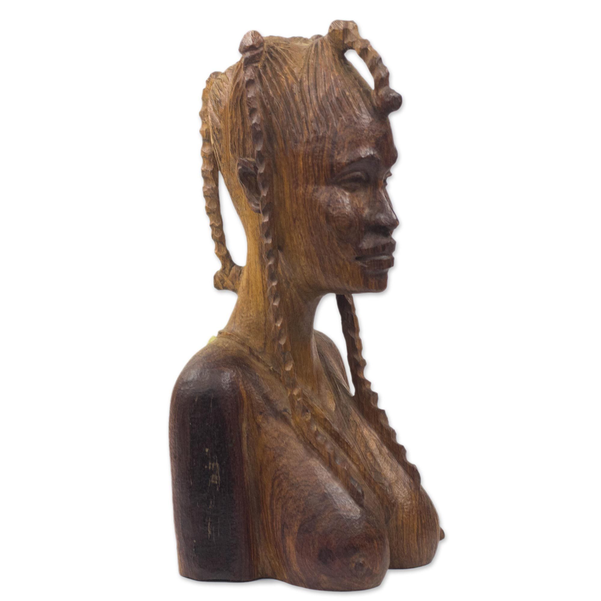 Mahogany Wood Bust Sculpture of a Woman with Braided Hair Plaited