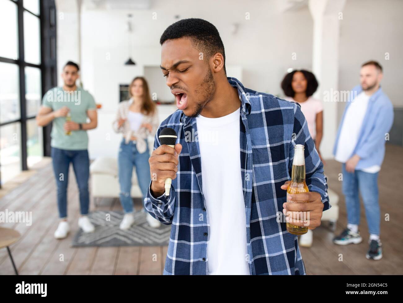 Cool black guy with beer bottle singing karaoke into microphone on