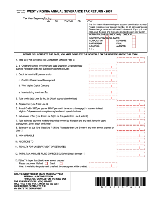 Form Wv/sev401 West Virginia Annual Severance Tax Return 2007