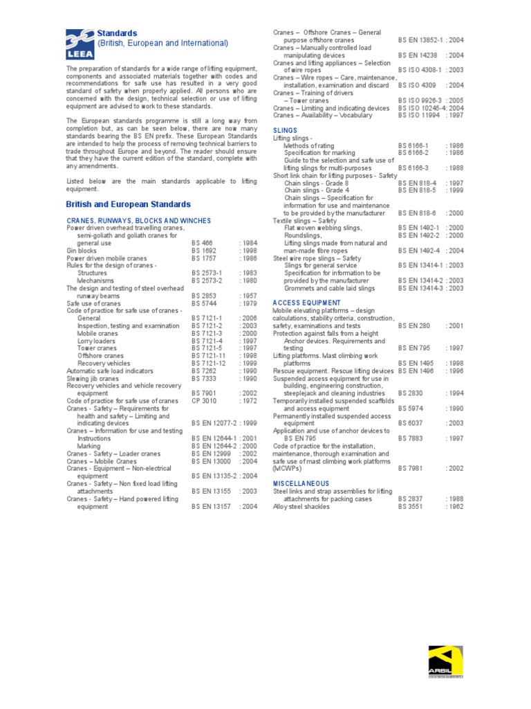 BS Standards for Lifting Equipment Crane (Machine) Rope Lifting Equipment Standards this leaflet provides general information about the requirements of the lifting operations and lifting equipment. lifting appliances in general lifting platforms for disabled people, see 11.180.10: in respect of statutory examination of lifting equipment they apply not only to employers but also to those who hire out lifting. we inspect and certify lifting and materials handling. Lifting Equipment Standards.