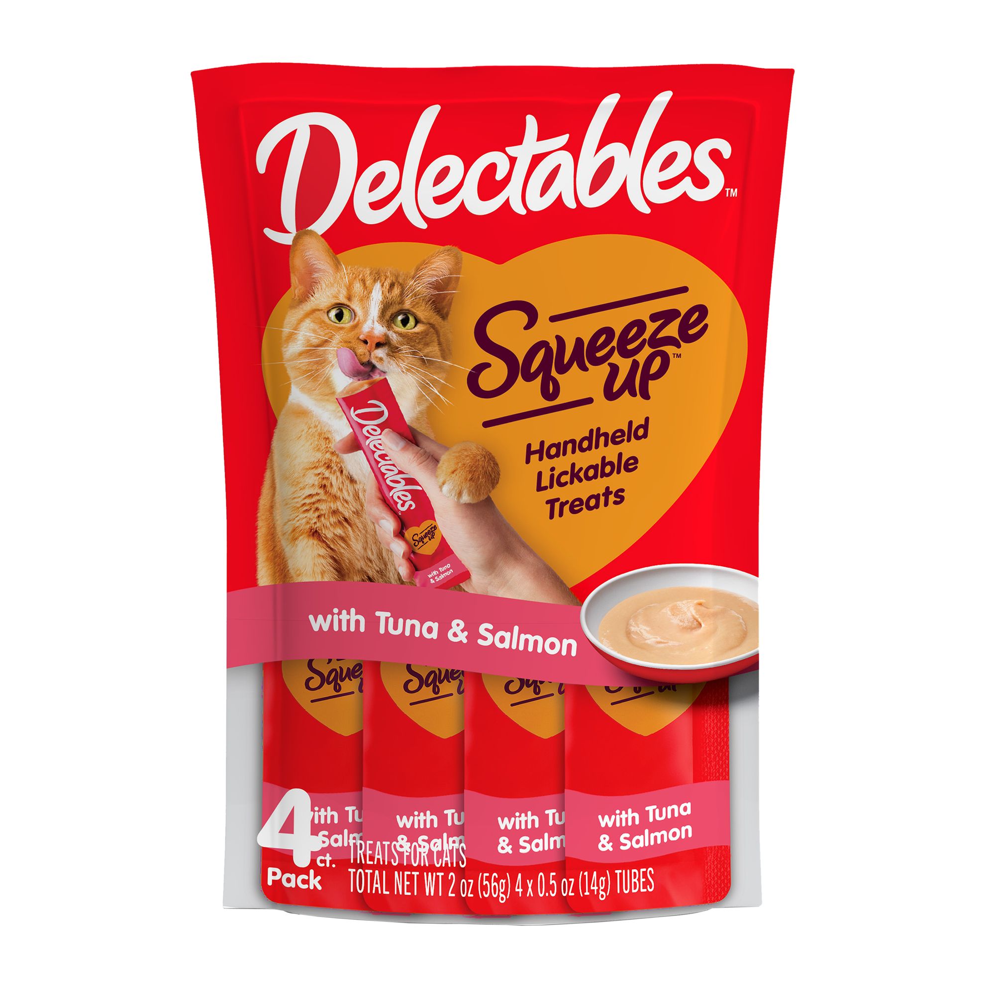 HARTZ Delectables Squeeze Up Tuna & Salmon Lickable Cat Treats, 0.5oz Squeeze Up Tuna Cat Treats Includes 4, 0.5 ounce tubes. 20 x 0.5oz squeeze up lickable cat treat tubes. Delectables squeezeup treats are a rich, thick puree tuna cat treat in a lickable tube that you can hand feed for a fun and delicious squeeze cat. Rich and thick tuna and salmon flavored puree comes in a lickable tube that pet parents can hand feed. Squeeze Up Tuna Cat Treats.