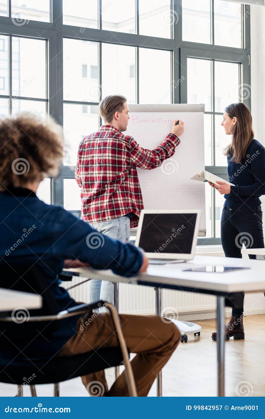 Student Writing on a Training Paper Board while Presenting with Stock