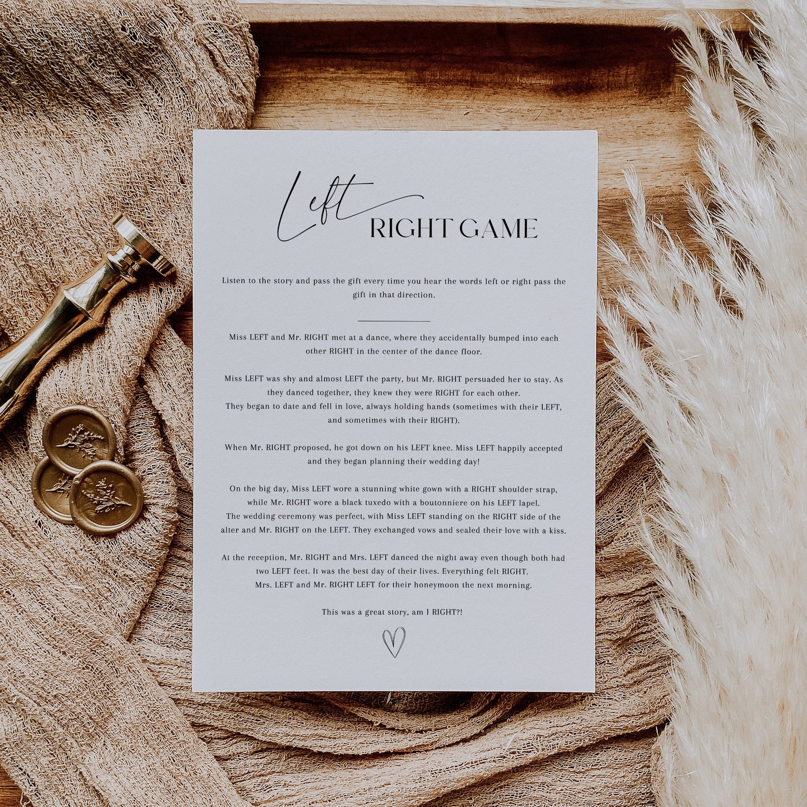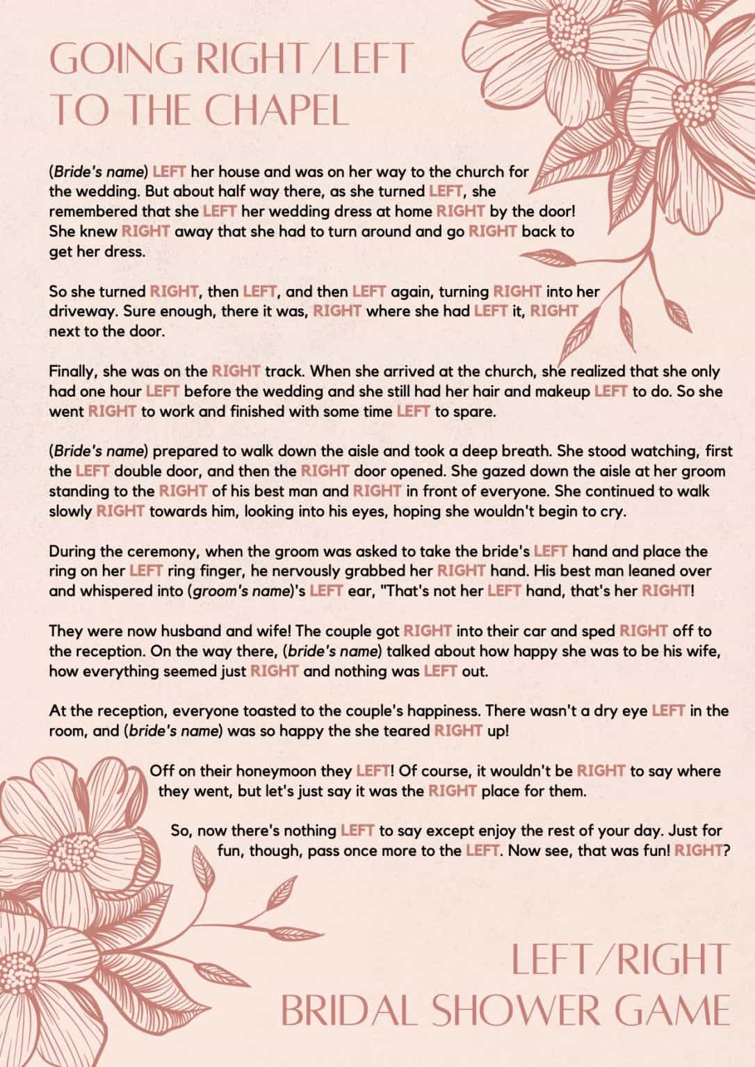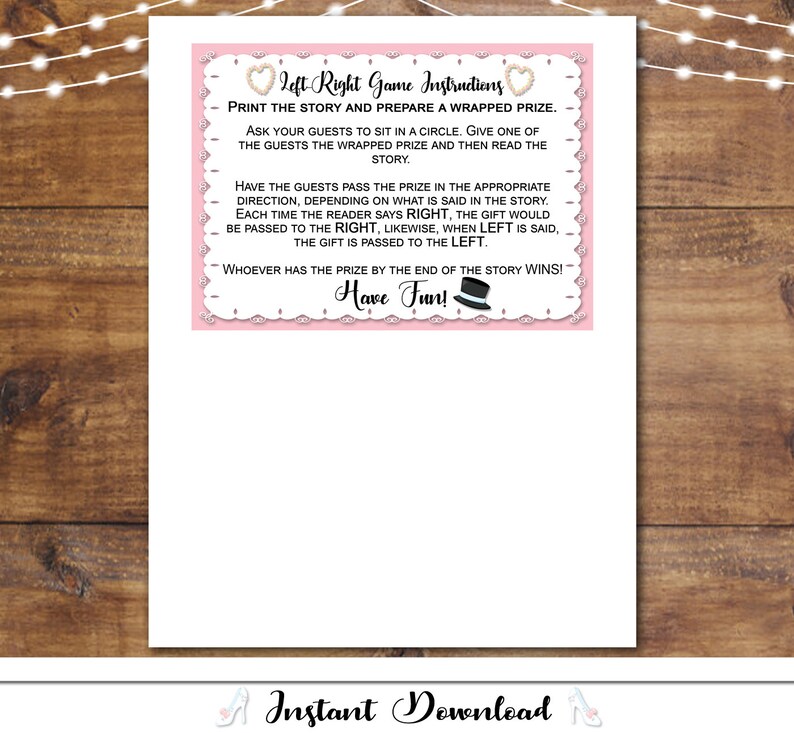 Bridal Shower Game Right Left Guess the titles of these romantic tunes. The left/right story game is a well known bridal shower activity that is easy to setup. Guests are seated in a circle. The right left bridal shower game is an activity that guests of all ages enjoy. This game is fun because it is a story that ends with an awesome gift! . Bridal Shower Game Right Left.