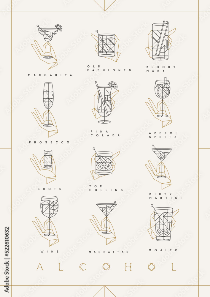 Art deco cocktails poster with glasses and names of the drink