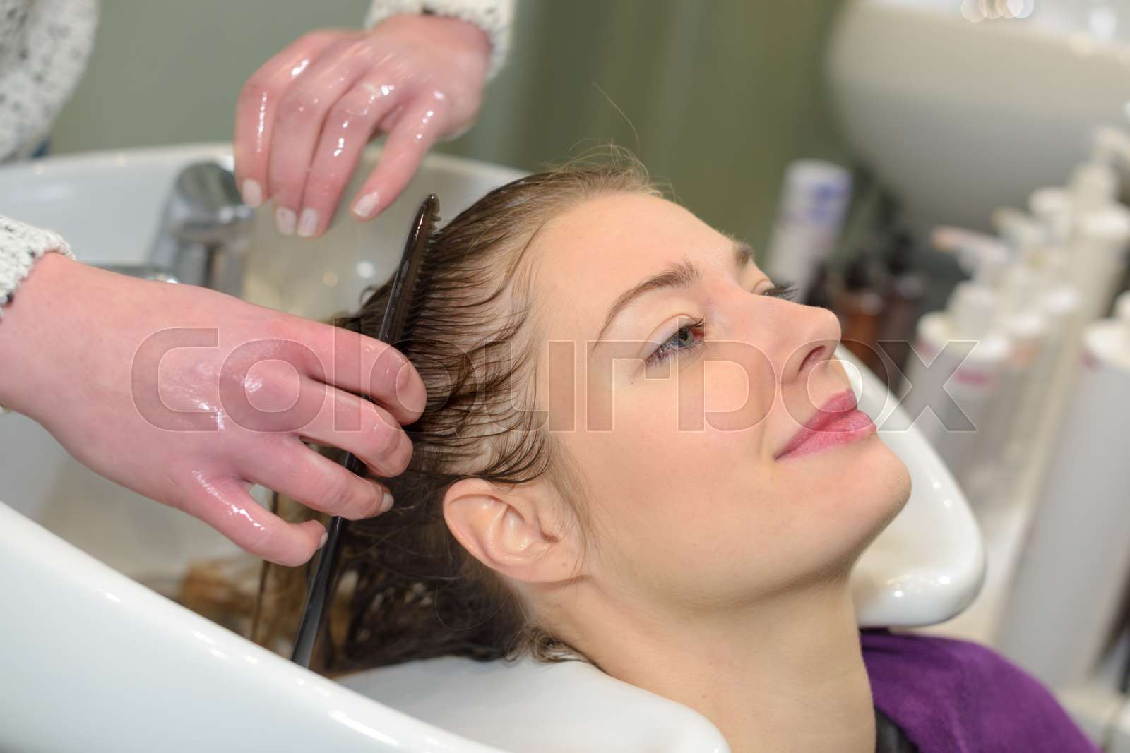 woman washing head in hair salon Stock image Colourbox