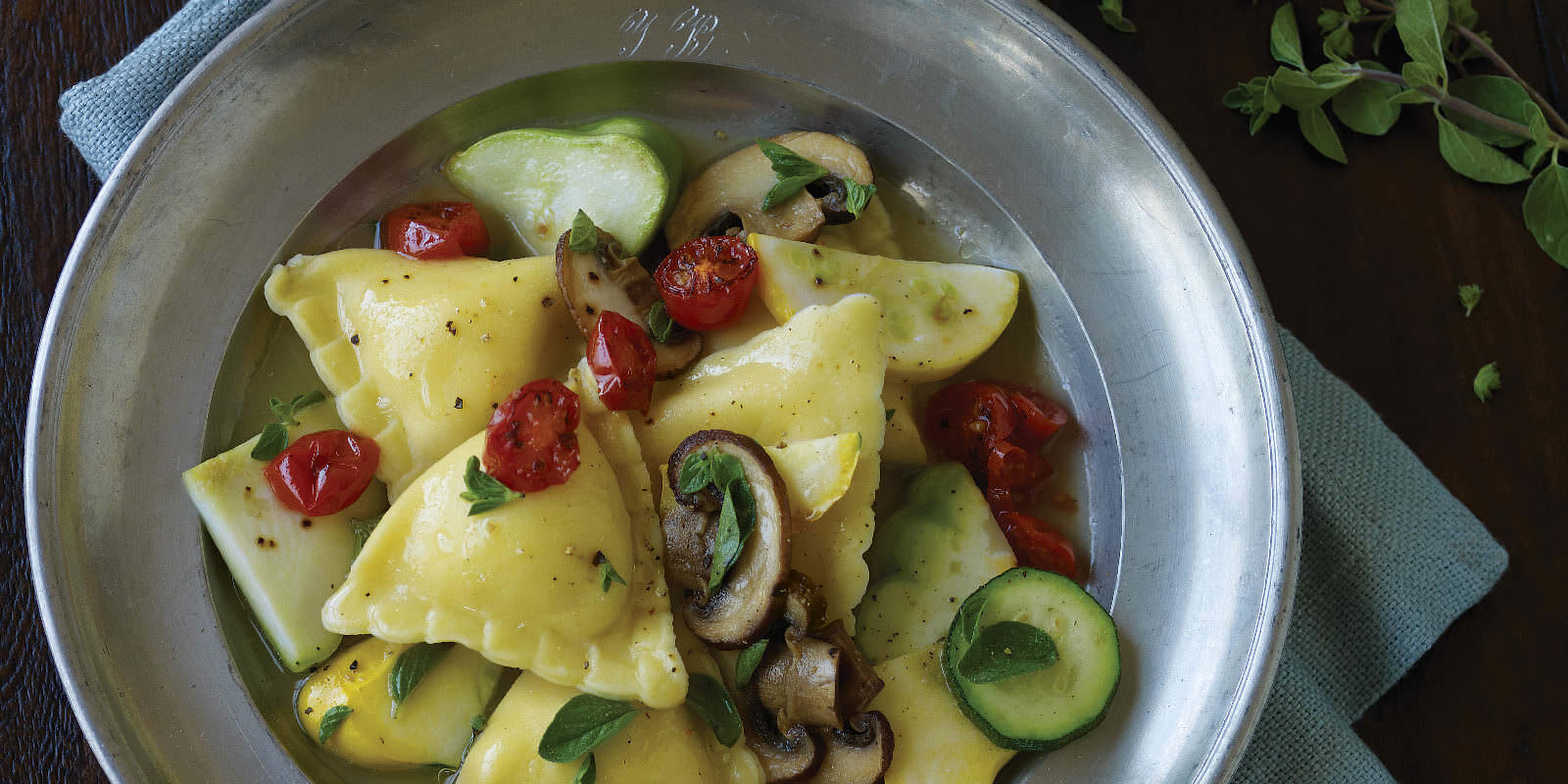Chicken & Mozzarella Ravioli with Sautéed Mushrooms, Squash and Cherry