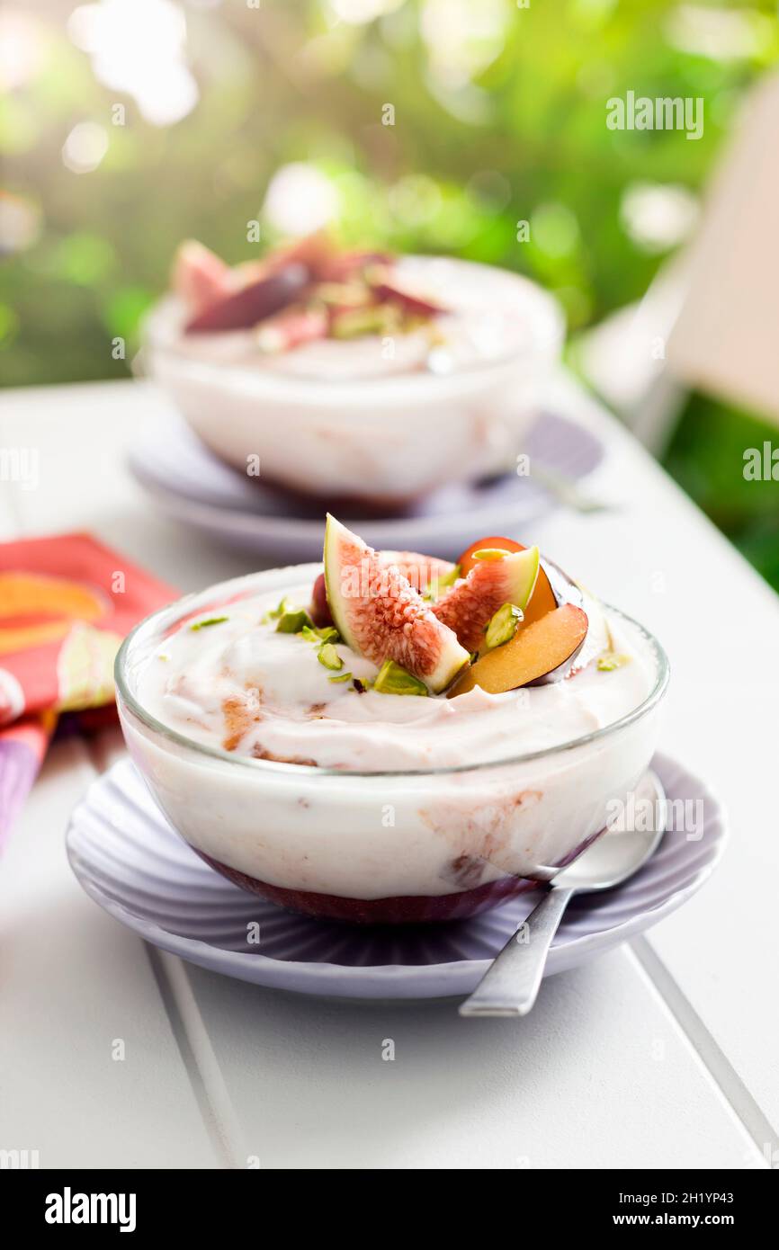 Yoghurt with berry compote, figs and pistachios Stock Photo Alamy