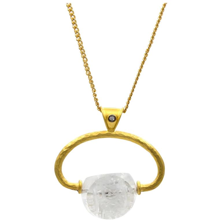 HandCarved Quartz Gold Vermeil Pendant with Diamond Accent For Sale at