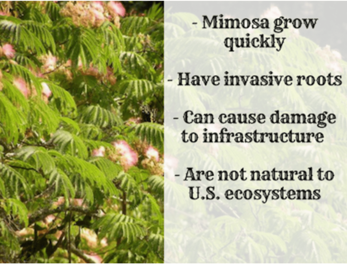 These food sources are becoming increasingly scarce because of the aggressive nature of invasive species like the mimosa tree. Leaves and blooms from a mimosa tree are harmless, but. The mimosa's seeds and seed pods are poisonous. Like locust trees, they are poisonous. They can cause seizures and even death in humans (especially children), pets, and livestock. If it is, try to If you already have a mimosa tree (or if mimosa seeds constantly fall into your garden from a neighboring property), check with your state’s department of agriculture to find out whether mimosa is invasive in your area. The limbs of the tree are weak and may be damaged by strong winds, snow, and. On the other hand, opponents of persian silk trees say that their vigorous growth crowds out native shrubs and trees, and their. The mimosa tree was introduced as an ornamental tree, but it escaped cultivation and is now