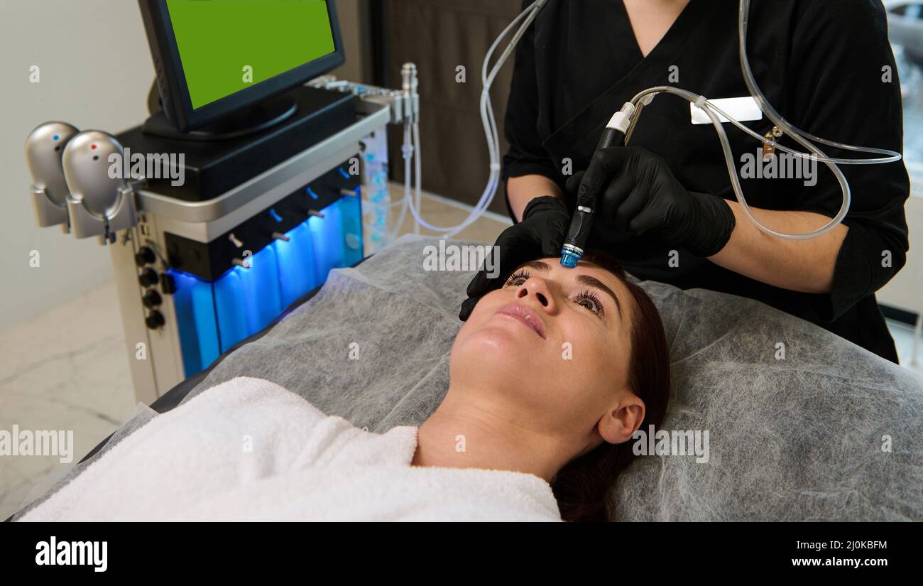 Woman relaxing on massage table while doctor cosmetologist performing