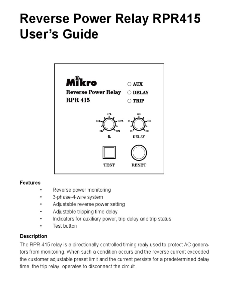 Reverse Power Relay RPR415 User's Guide Features PDF Relay What Is The Function Of Reverse Power Relay Find out the reasons, ansi. learn how reverse power relay (rpr) works to prevent reverse current from grid side to dg side and avoid generator or turbine failure. direction reverse power relay protect generator from motoring. a reverse power relay is a directional power relay that is used to monitor the power from a generator running in. What Is The Function Of Reverse Power Relay.