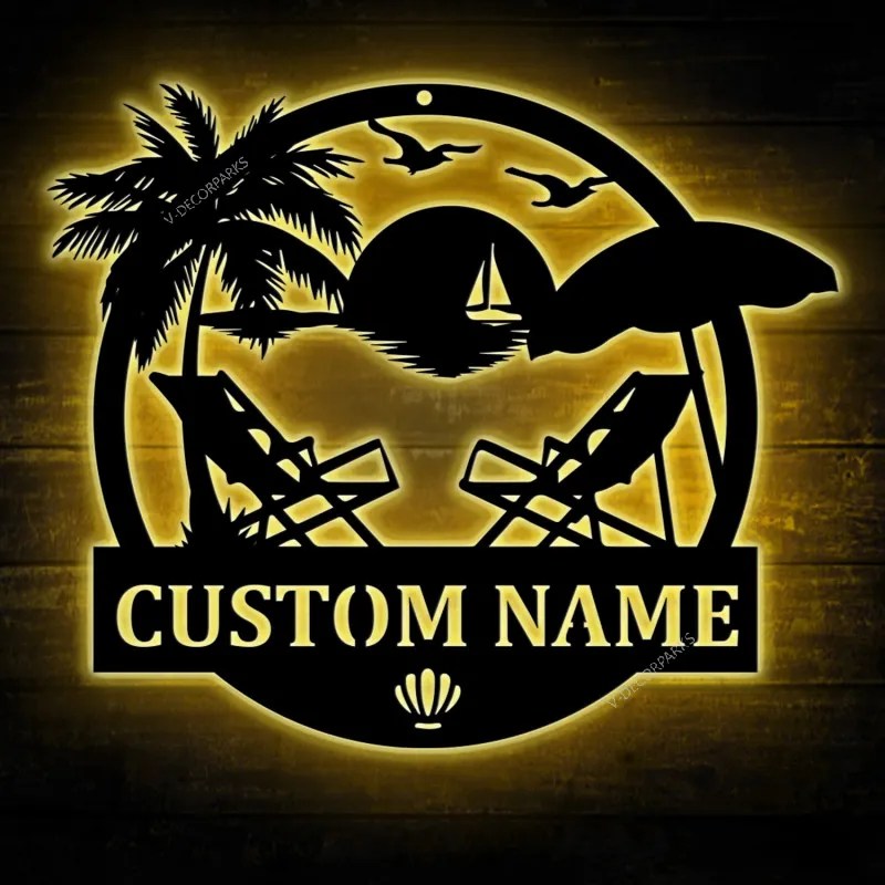 Custom Beach Scene Monogram Sign Led Light, Personalized Palm Tree Wall