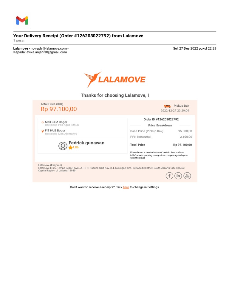 Gmail Your Delivery Receipt (Order 126203022792) From Lalamove PDF Delivery Receipt On Gmail Html, read receipt, delivery receipt, and email tracker. Learn how to use gmail's read receipts feature to track when recipients open your emails. If you want to use read receipts with your regular @gmail address, i fear that your only option is using an extension. 2) click on the gear icon at top right corner of your gmail. However, if. Delivery Receipt On Gmail.